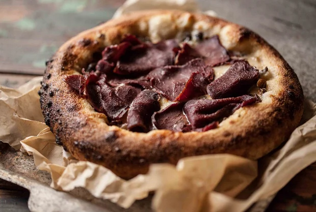 ШАГ 4 Приготовить пирог. Перед выпеканием поделить тесто на шарики по 200 грамм, раскатать. На дно выложить натертую моцареллу, на сыр выложить грибы в сливках. Затем выложить готовую тушенку из оленины, чуть завернуть тесто по краям внутрь и выпекать пирог при температуре 280 градусов 10 минут. На готовый пирог выложить ломтики сырокопченого оленя и подавать на стол.