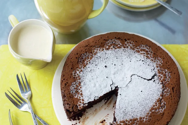 ШАГ 6 Выпекать пирог около 50 минут, до плотности. Проверять готовность на ощупь: если пирог стал плотным, но не твердым, он готов. Дать ему полностью остыть в форме, затем достать и присыпать сахарной пудрой и/или какао-порошком перед подачей. Пирог можно подавать сразу или дополнительно остудить в холодильнике, чтобы он стал плотнее.