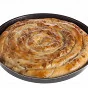 ШАГ 6 Смазать растянутое тесто смесью сливочного и растительного масла, выложить немного начинки на всю поверхность теста и скрутить его в рулет. Этот рулет уложить спиралью в центр формы для выпечки. Так же поступить с остальным тестом и начинкой. Каждый следующий рулет должен продолжать спираль, чтобы в итоге получился большой пирог-улитка.