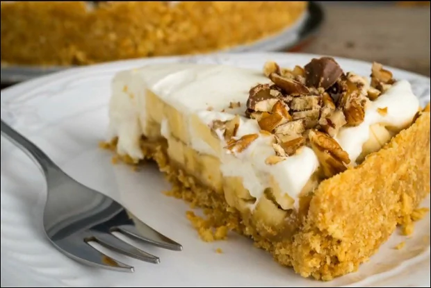 ШАГ 5 На основу распределить вареную сгущенку, сверху выложить банан, а следующим слоем выложить сливки и украсить грецкими орехами с Twix. Накрыть пленкой и убрать на 2 часа в холодильник.