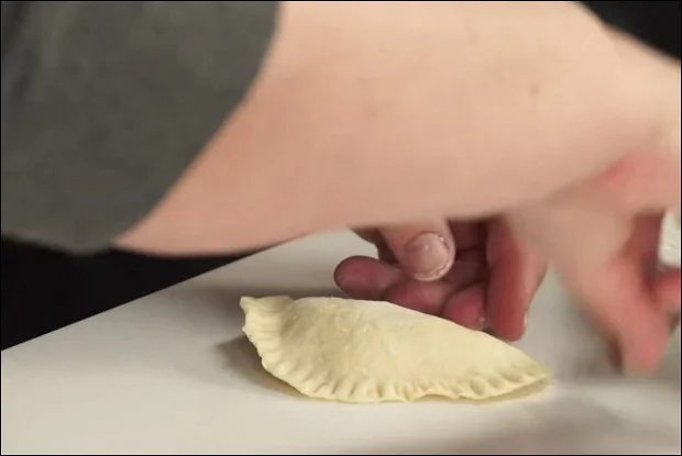 ШАГ 4 Слепить пирожки. Фарш положить на одну половину заготовки. Сложить пополам и защипать как вареники.
