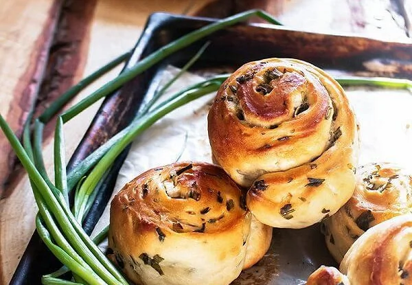 ШАГ 3 Затем обмять, дать еще раз подняться, снова обмять и выложить на смазанную маслом поверхность. Скалку также смазать маслом. Раскатать тесто (не тонко) в пласт примерно 30×30 см, нашинковать оставшийся лук и распределить по поверхности теста. Скрутить рулетик из теста, его необходимо нарезать острым ножом, примерно на 8 частей.