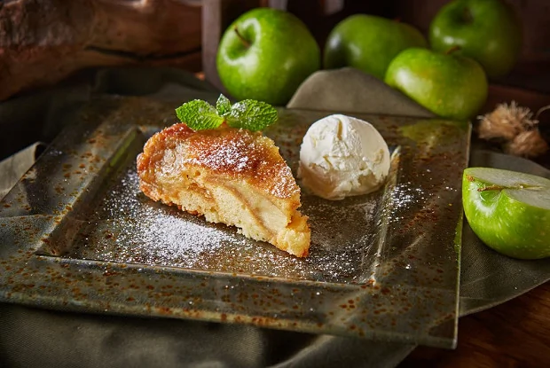 ШАГ 8 Готовую шарлотку положить на стол вверх тормашками, чтобы яблоки, лежавшие на дне, оказались сверху. Посыпать сахарной пудрой. Перед подачей, если пирог остыл, разогреть его и есть вместе с ванильным мороженым.