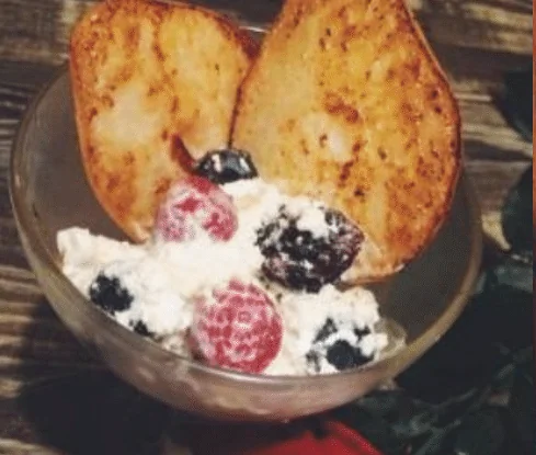 ШАГ 3 Выложить груши и творог, украшенный ягодами, в креманку. Подавать.