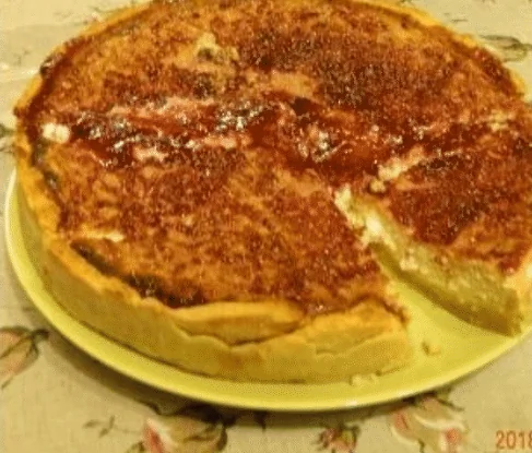 ШАГ 4 Корж достать из духовки, дать остыть. Аккуратно в корж влить начинку, чтобы она доходила до его краев. Выпекать при температуре 200 градусов 50 минут.