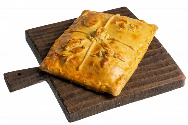 ШАГ 9 Взбить желтки вилкой с небольшим количеством воды и смазать ими кулебяку. Из обрезков теста сделать украшения, например можно проиллюстрировать находящиеся внутри кулебяки начинки. Также смазать их желтком, наколоть тесто шпажкой, чтобы дать выход воздуху, и отправить кулебяку в духовку, разогретую до 180 градусов, на 30–40 минут.