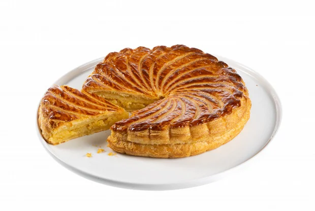 ШАГ 3 Из слоеного теста вырезать два диска, выложить на один из них крем франжипан ровным слоем, отступая от краев теста на 1–2 см. На этом этапе можно вложить в пирог сюрприз в виде сухой фасолинки или небольшой фарфоровой фигурки. Смочить края теста водой, накрыть вторым диском слоеного теста и аккуратно прижать края, стараясь не сильно деформировать его.