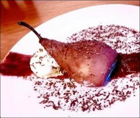 Пряная груша «Белль-Элен» с творожно-лимонным мороженым и винно-малиновым соусом