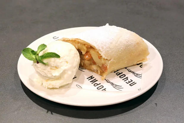 ШАГ 8 Готовый рулет переложить швом вниз на противень, покрытый пергаментной бумагой. Скрутить концы и обрезать лишнее. Густо смазать штрудель остатками сливочного масла. Выпекать при температуре 170 градусов около 20–25 минут. Готовый штрудель посыпать сахарной пудрой.
