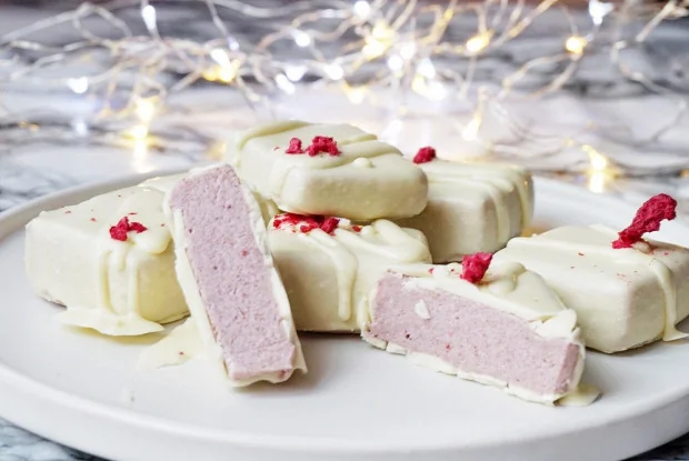 ШАГ 2 Смешать растопленное какао-масло и кокосовое молоко до гладкой однородной массы. Переложить в глубокую миску, так будет удобнее всего глазировать. Опустить начинку в миску и полностью утопить, достать с помощью вилки и уложить на пергамент. Когда вся начинка будет глазированной, убрать в холодильник минут на 30.