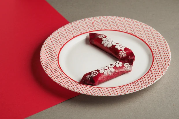 ШАГ 10 Каждую трубочку обернуть малиновой бумагой, как конфету. Перед подачей разогреть блины в печи СВЧ. Через трафарет посыпать блины сахарной пудрой.