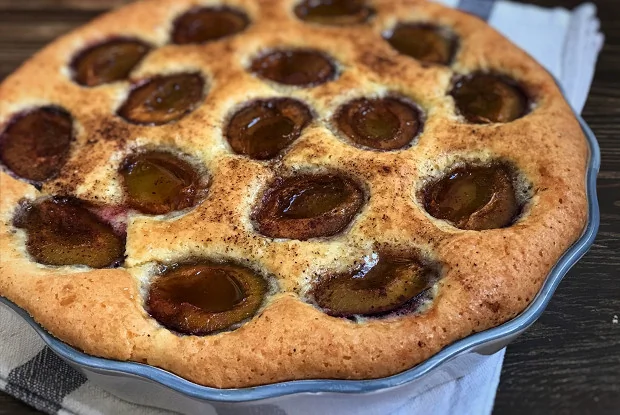 ШАГ 6 Тростниковый сахар смешать с корицей. Сливы выложить на тесто разрезом вверх, не вдавливая их в тесто, посыпать сверху сахаром с корицей.