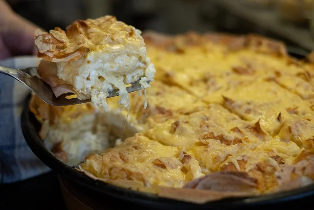 ШАГ 9 Залить пирог остатками яиц и сливок. Пролить все разрезы. Отправить в духовку, разогретую до 180 градусов, на 30 минут. Через полчаса достать, посыпать пирог 50 г тертого тильзитера или другого полутвердого сыра, поставить в духовку еще на пять минут. Это нужно для того, чтобы у ачмы появилась румяная корочка.