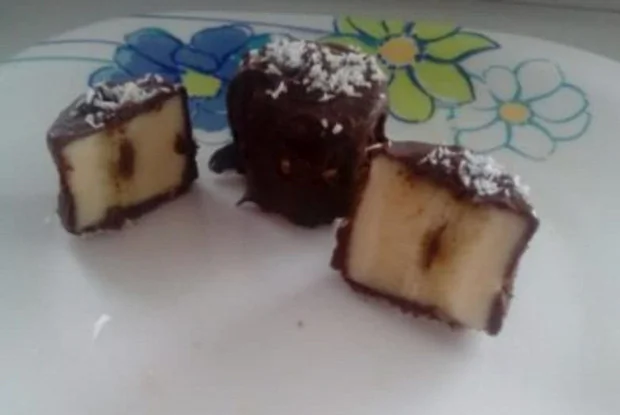 ШАГ 3 Кусочки бананов наколоть на шпажку и обмакнуть целиком в растопленный шоколад. Выложить на тарелку и подать к столу.
