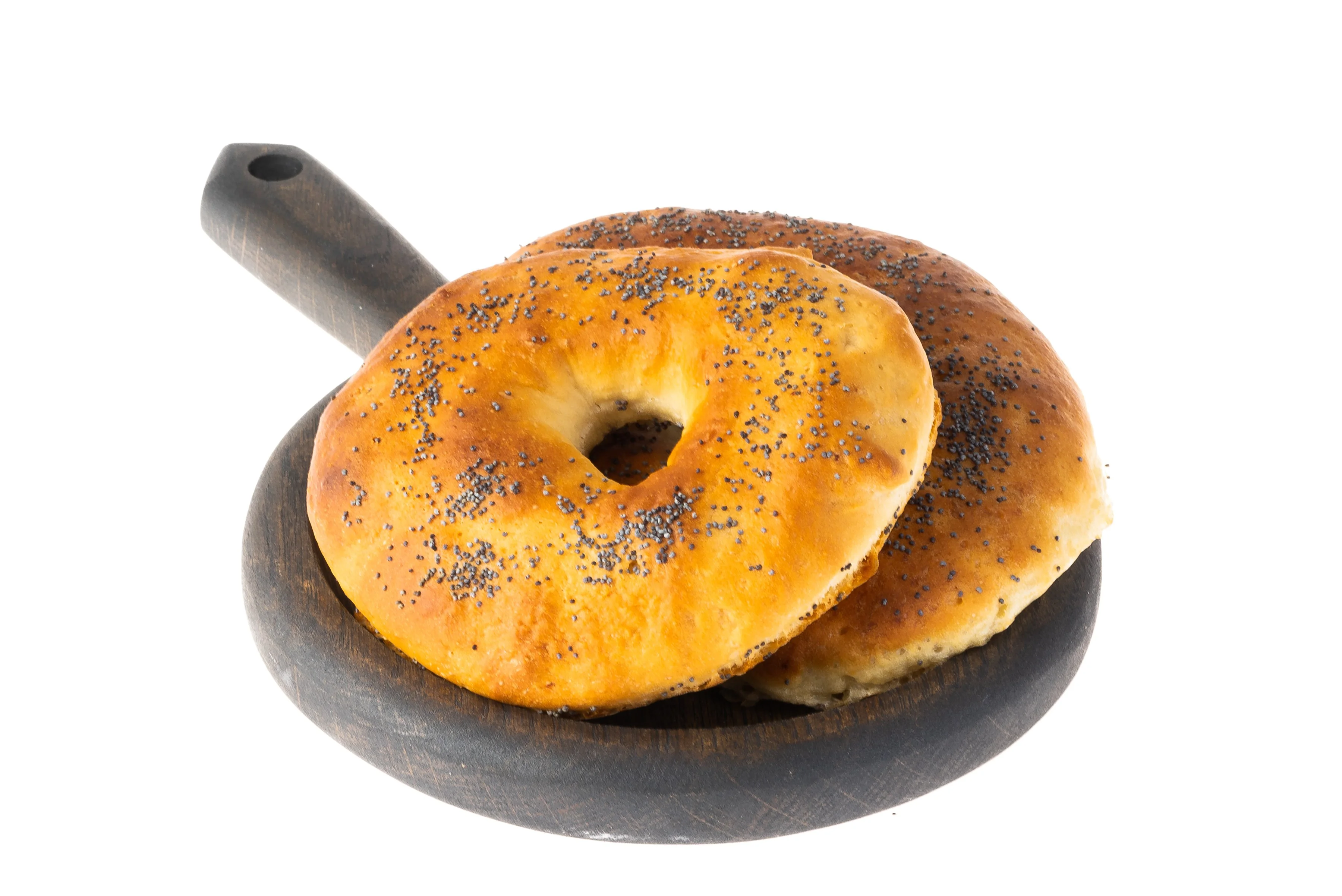 ШАГ 8 Каждый бублик еще слегка растянуть и подправить его форму руками, затем опустить в кипяток. Дать ему обвариться 5 секунд. Достать шумовкой и переложить на решетку. Посыпать бублики маком. Переложить бублики посыпкой вверх на застеленный пергаментом противень и выпекать 15–20 мин. Каждый бублик должен зазолотиться, но ни в коем случае не подгореть.