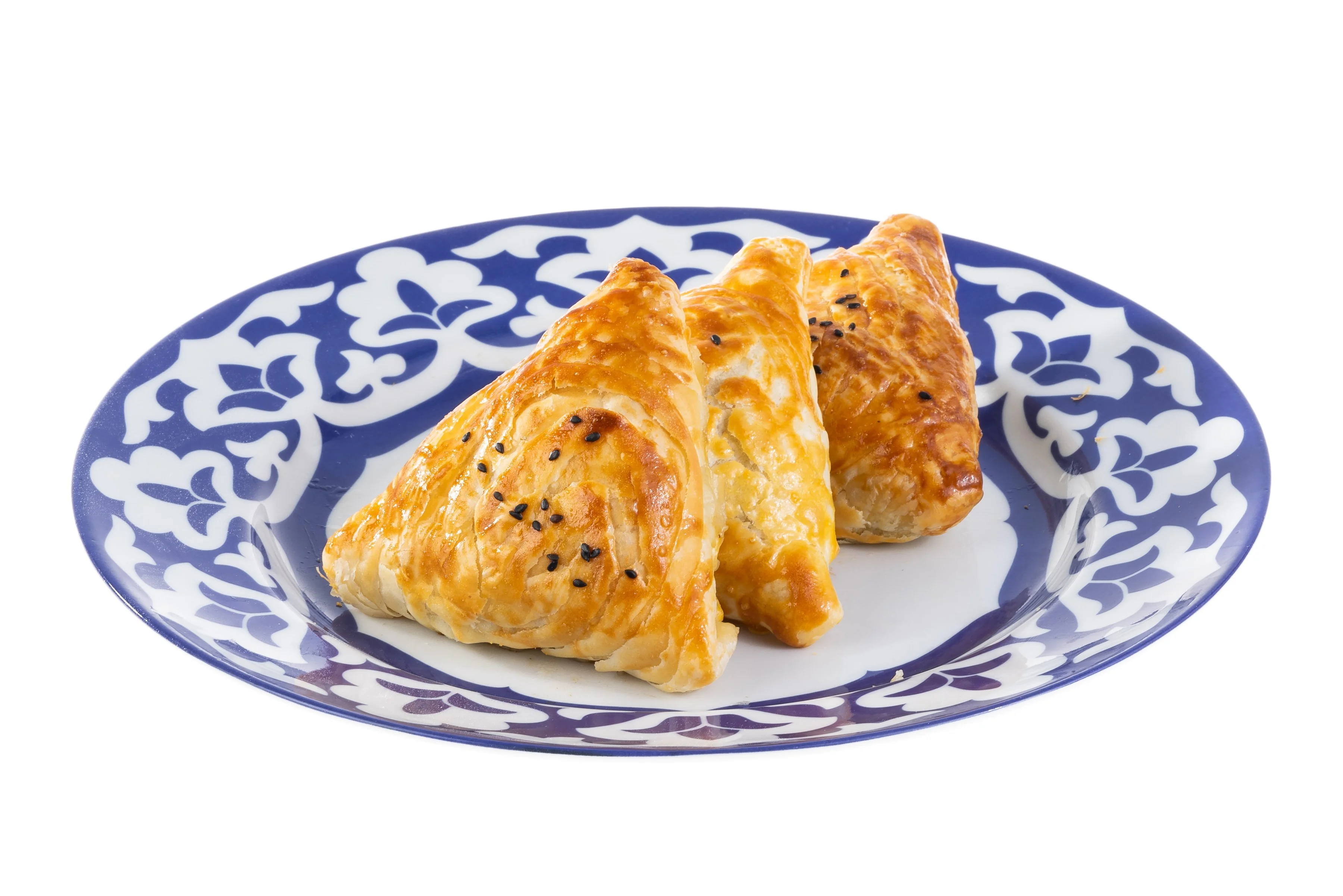 ШАГ 5 Выложить самсу на противень швом вниз, смазать взбитым желтком и посыпать кунжутом. Выпекать 30 минут в духовке, разогретой до 180 градусов.