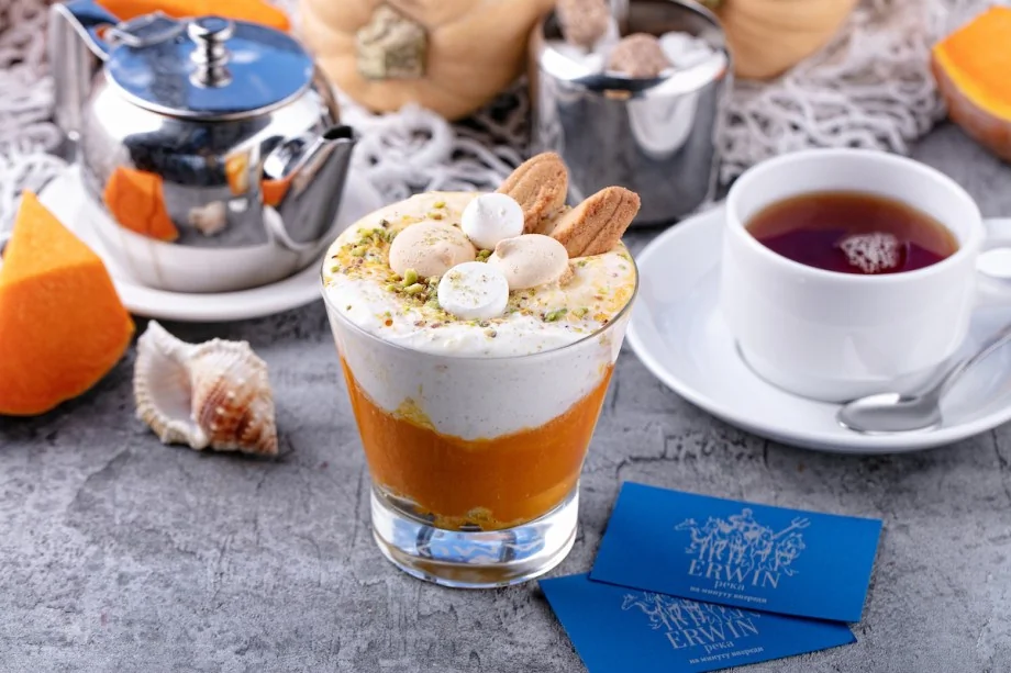 ШАГ 5 Печенье поломать на небольшие кусочки, разложить в креманки. На печенье разложить сладкое тыквенное пюре, затем — сливочный мусс. Украсить безешками и рублеными фисташками.