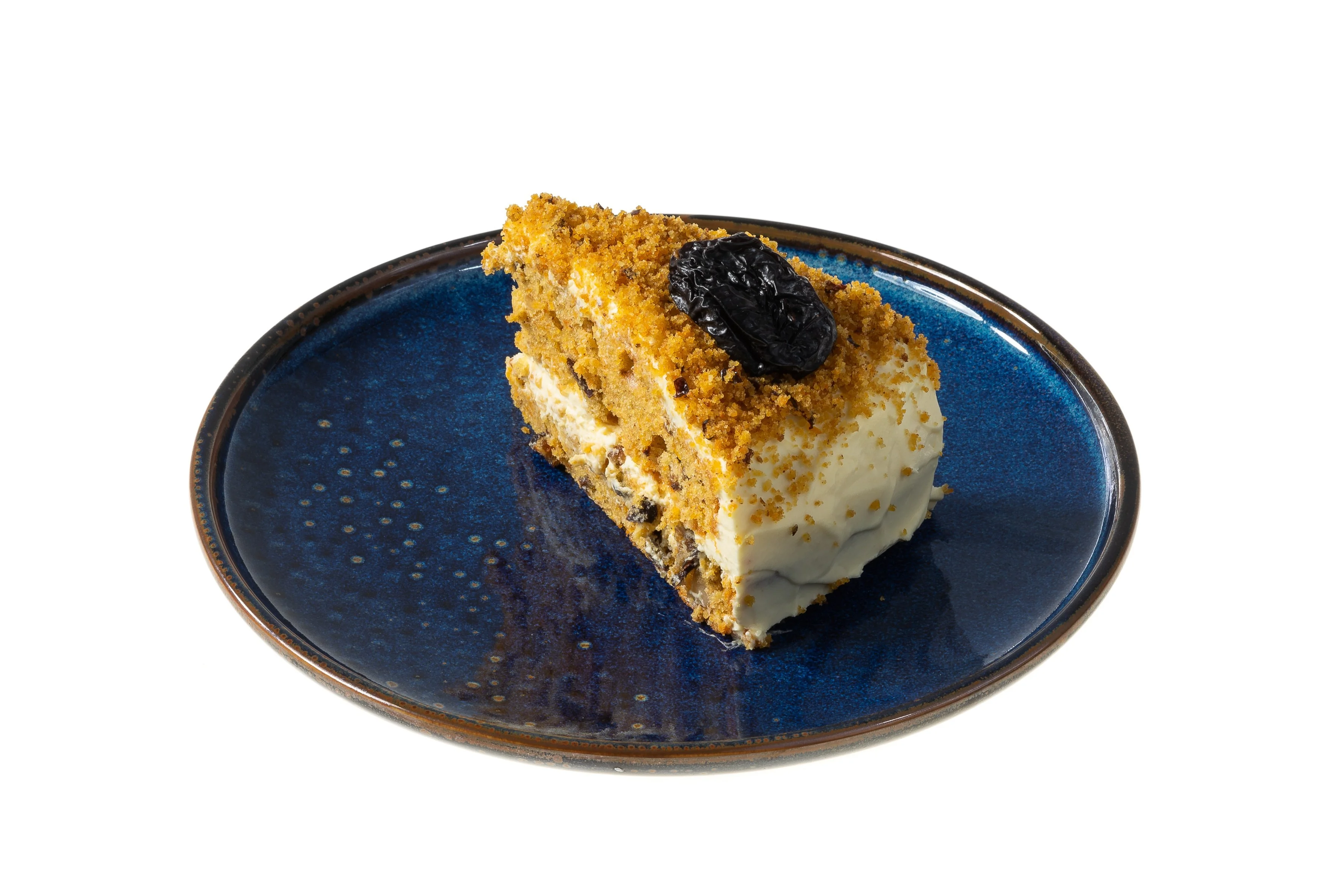 ШАГ 13 Собрать торт, промазав каждый корж сметанным кремом. Верхний корж также смазать кремом и украсить орехами и черносливом. Убрать торт в холодильник минимум на 2 часа, после чего его можно будет подавать.