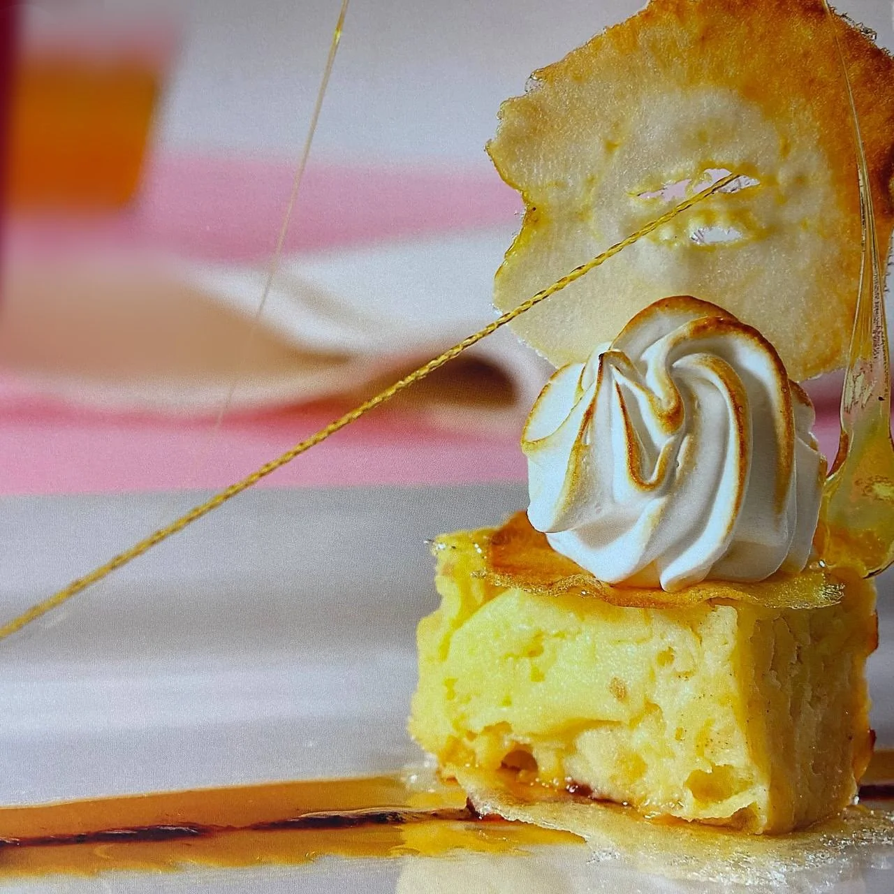 ШАГ 4 Перед подачей выложить на каждую порцию слой безе и посыпать корицей, которую затем подрумянить в духовке или с помощью кулинарного фломбера. Каждую порцию украсить сушеными яблоками.