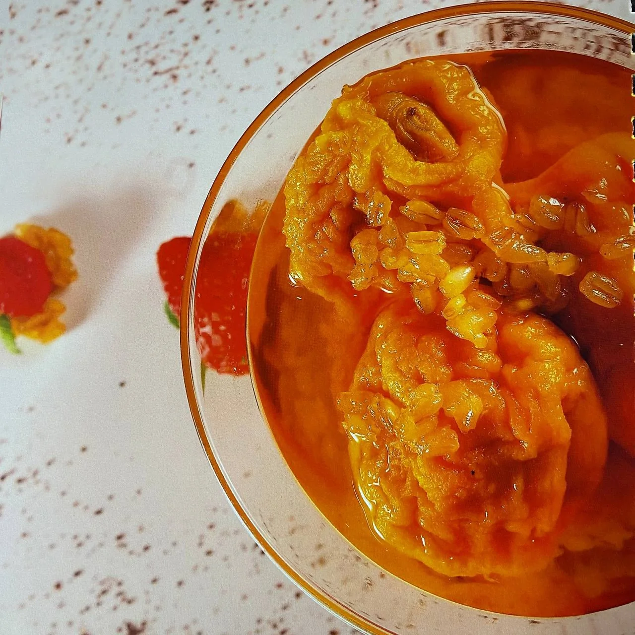 ШАГ 5 Разложить моте-кон-уэсильос в порционную посуду, добавить полученный сок и украсить каждую порцию ягодой красного цвета и немного моте.