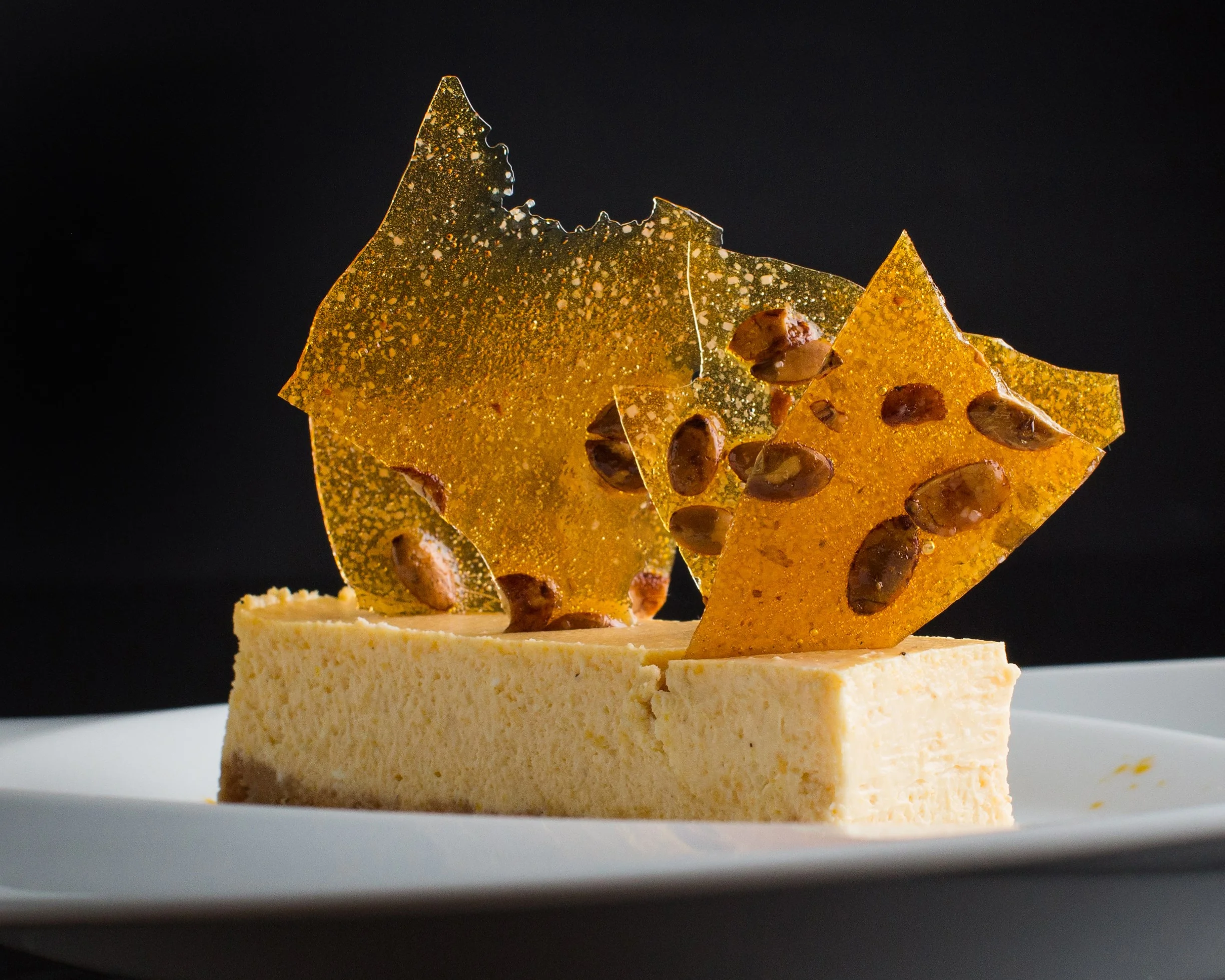 ШАГ 12 На тарелку выложить кули, сверху — чизкейк. Украсить карамелью с тыквенными семечками.