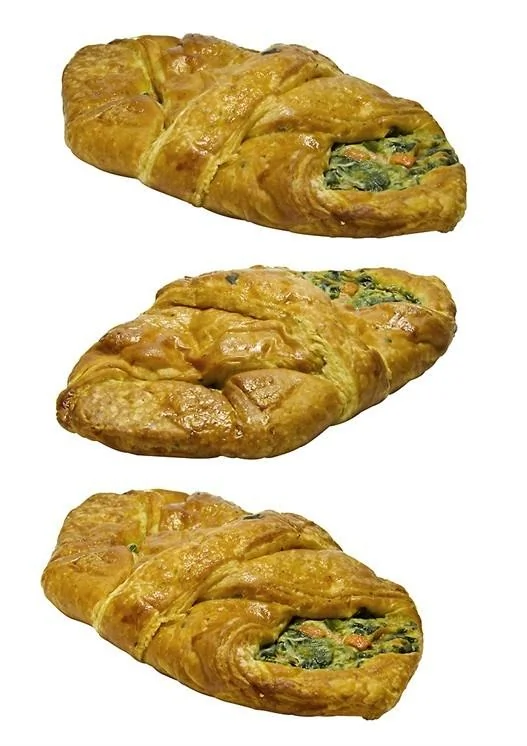 ШАГ 3 На столе, присыпанном мукой, раскатать тесто в тонкий пласт, вырезать 6 кружков. На середину каждого положить шпинатную начинку, слепить пирожки, смазать их взбитым яйцом и положить на смазанный растительным жиром противень.