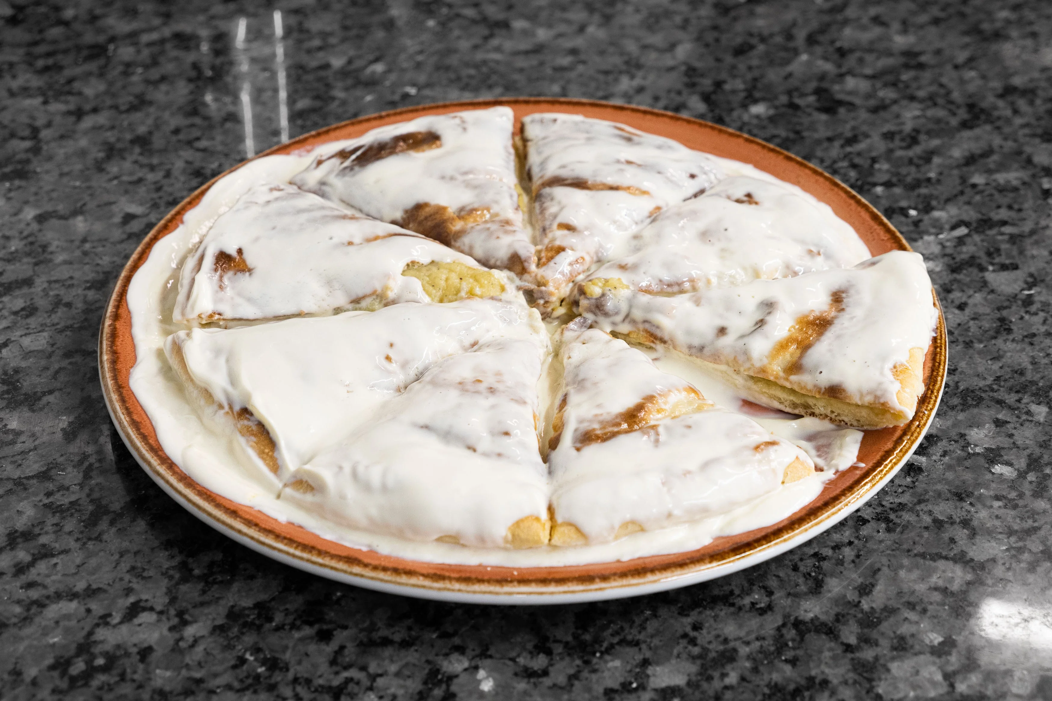 ШАГ 16 Сверху выложить пирог и полить его оставшейся жирной сметаной и немедленно подавать на стол. Нарезать пирог на восемь сегментов (для этого удобно использовать нож для пиццы).