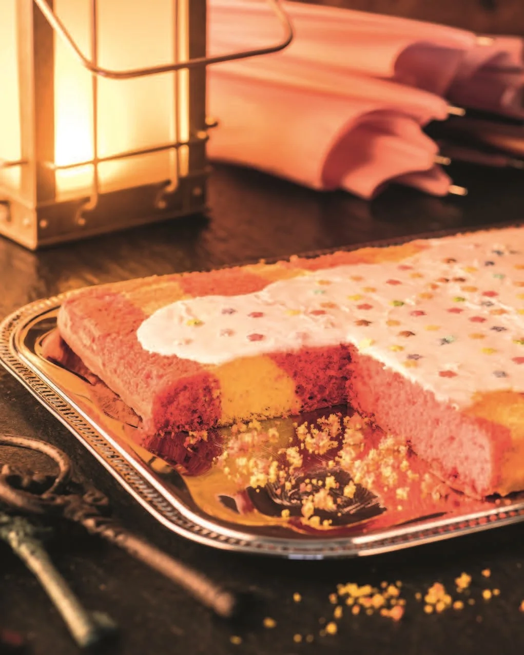 ШАГ 7 Тем временем для приготовления глазури тщательно смешать сахарную пудру и лимонный сок в небольшой миске и равномерно распределить по остывшему пирогу. Разровнять глазурь, добавить сверху цветную сахарную посыпку и оставить на полчаса перед подачей, чтобы глазурь подсохла.