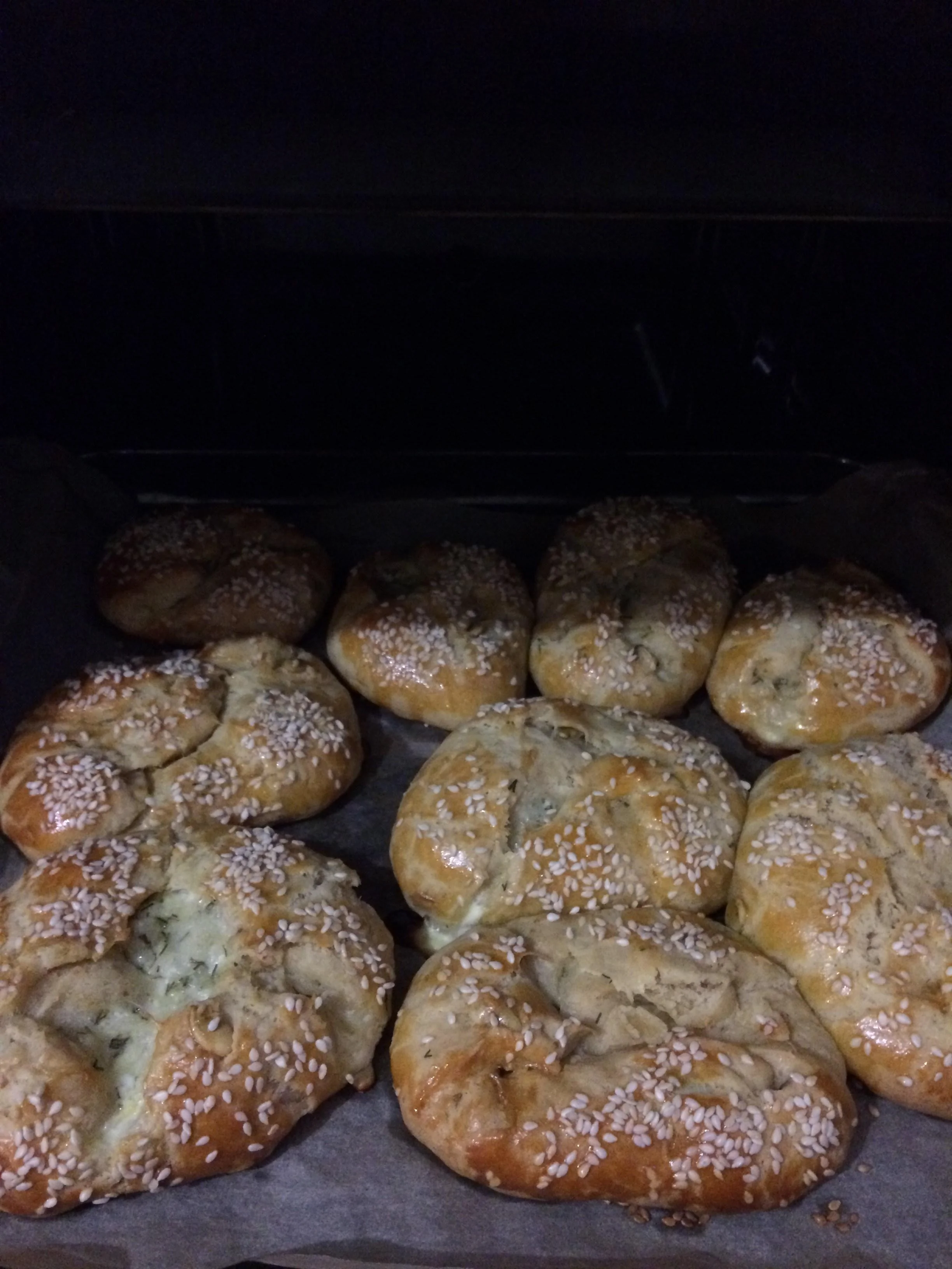 ШАГ 4 После того как булочки готоввы, положите их на противень смазанный маргарином. Сверху смазать яичным желтком и посыпать семенами кунжута. Выпекайте при 180 градусах в духовке.