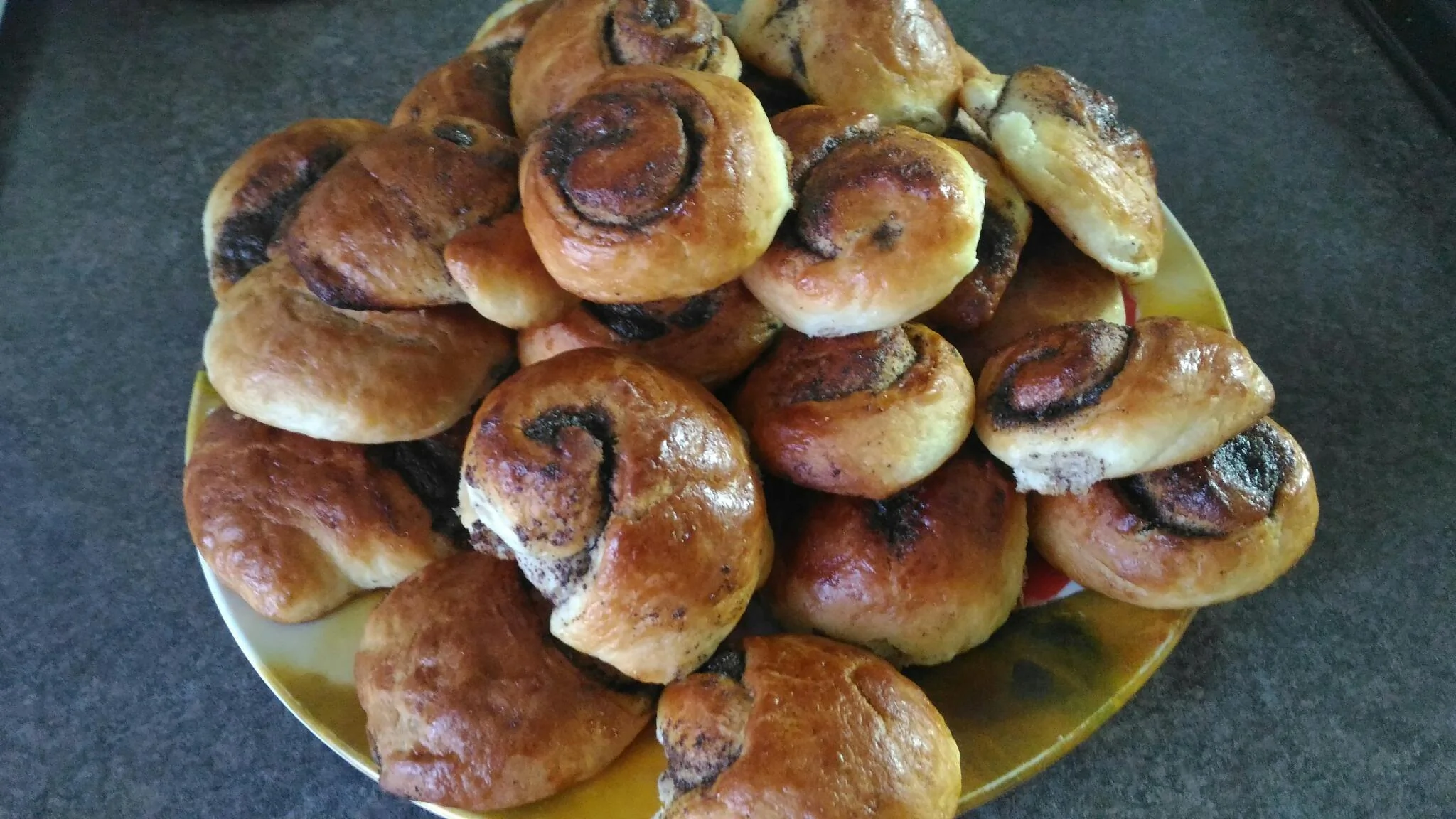 ШАГ 5 Противень выстелить бумагой, разместить на нем булочки. Сбить яйцо и смазать каждую булочку. В духовку поставить глубокую сковороду с кипятком. Выпекать булочки не менее 30 минут (до готовности) в предварительно нагретой до 200С духовке. Готовые булочки переложить на решетку, умыть (сбрызнуть) водой, накрыть салфеткой и остудить. Подавать к чаю.