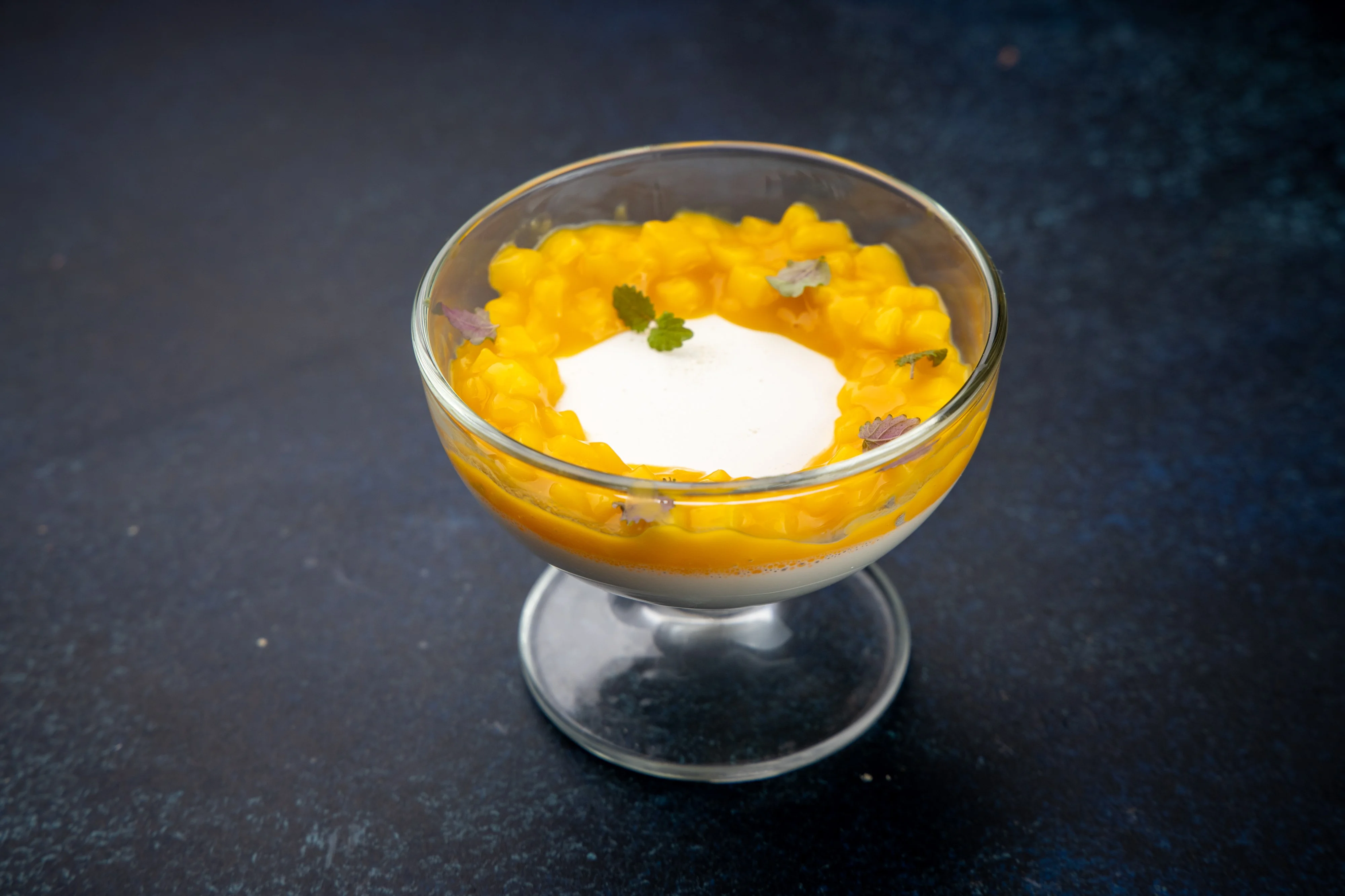 ШАГ 13 В креманки с застывшей панна-коттой вылить тропический соус со свежим манго.