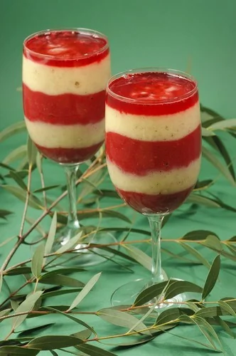 ШАГ 2 Разложите примерно по 1 столовой ложке клубничного пюре по креманкам. Положите небольшое количество пудинга и сверху клубничное пюре. Повторите слои несколько раз, закончив клубничным слоем.