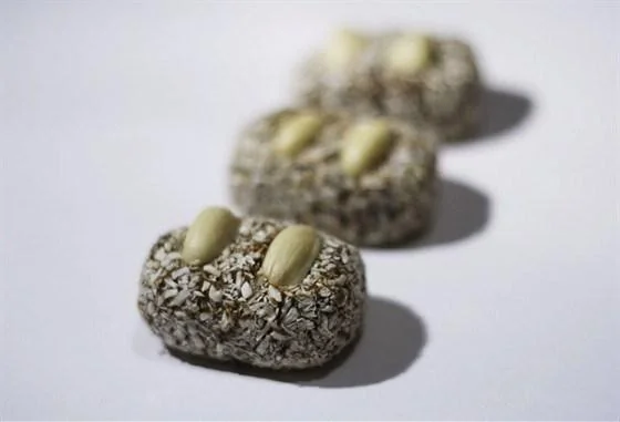 ШАГ 5 Оставшиеся 20 грамм арахиса очистить от шкурки, разделить каждое ядро пополам и украсить этими половинками конфеты.