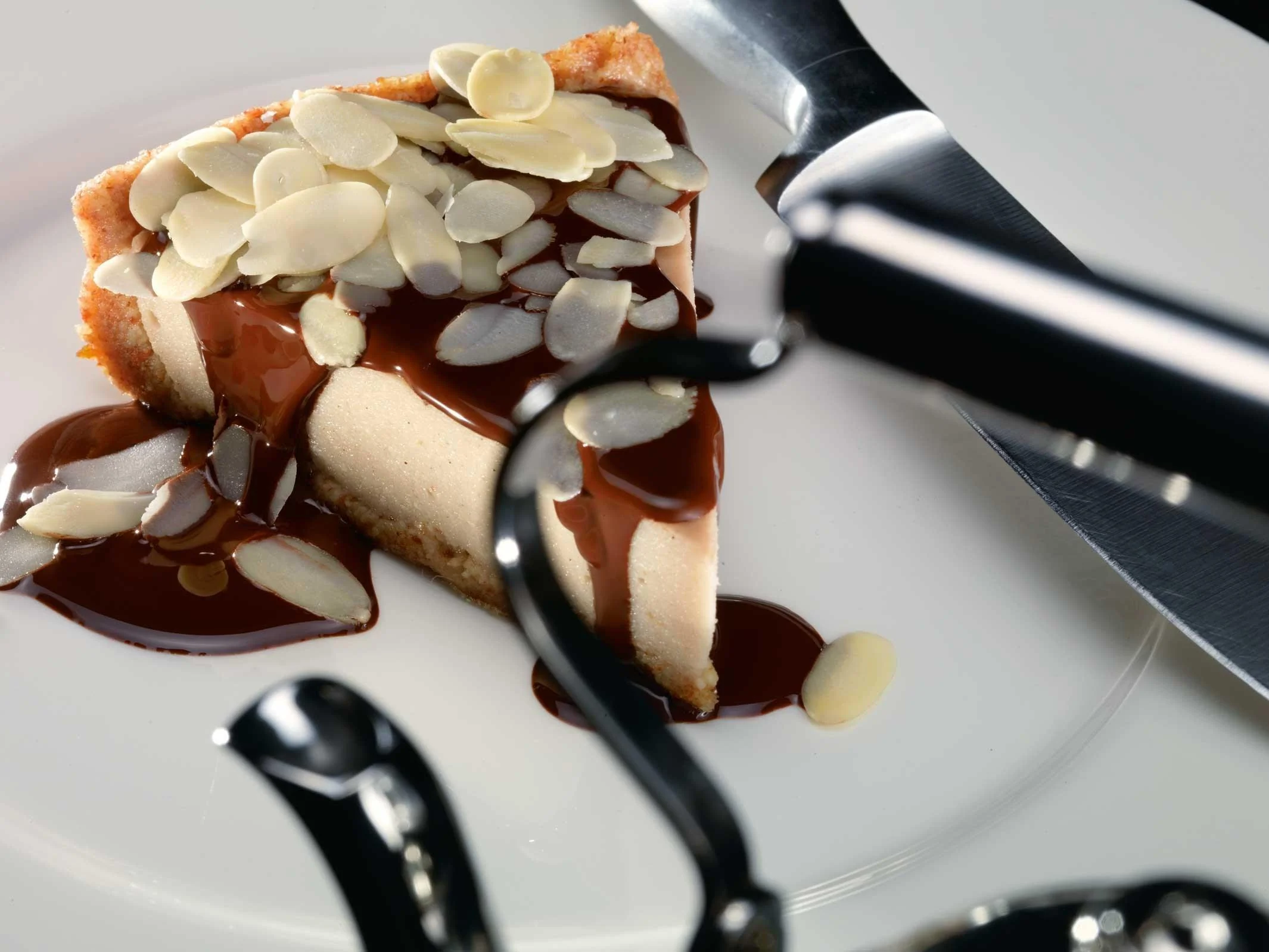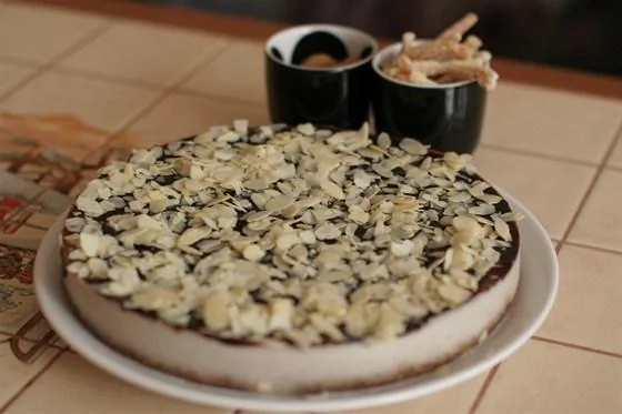 ШАГ 3 Через два часа вынуть торт из холодильника, снять форму, аккуратно снять пищевую пленку. Кусок торта подавать, полив растопленным шоколадом и украсив лепестками миндаля.