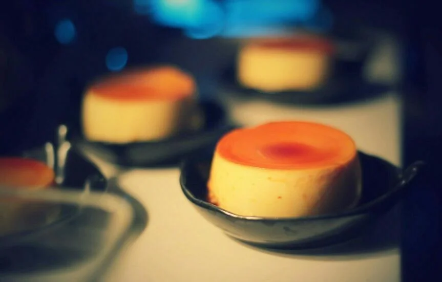 ШАГ 4 Разлейте смесь по формам. Переставьте на глубокий противень и залейте кипящей водой, чтобы она наполовину закрывала формы. Запекайте 20 минут. Переверните десерт на тарелки и подавайте.
