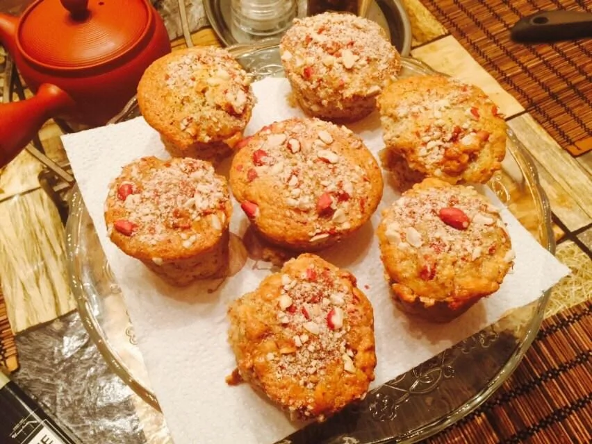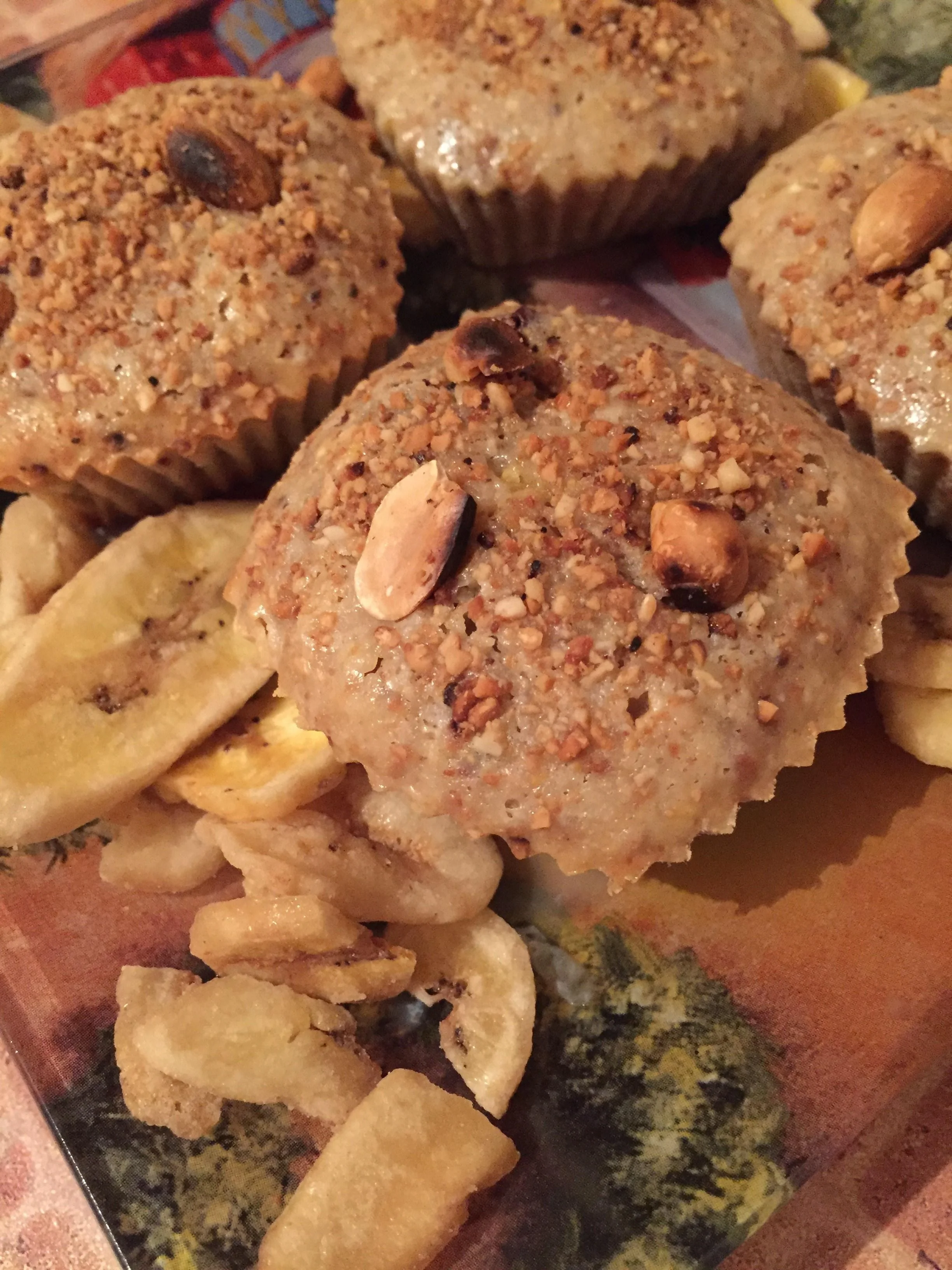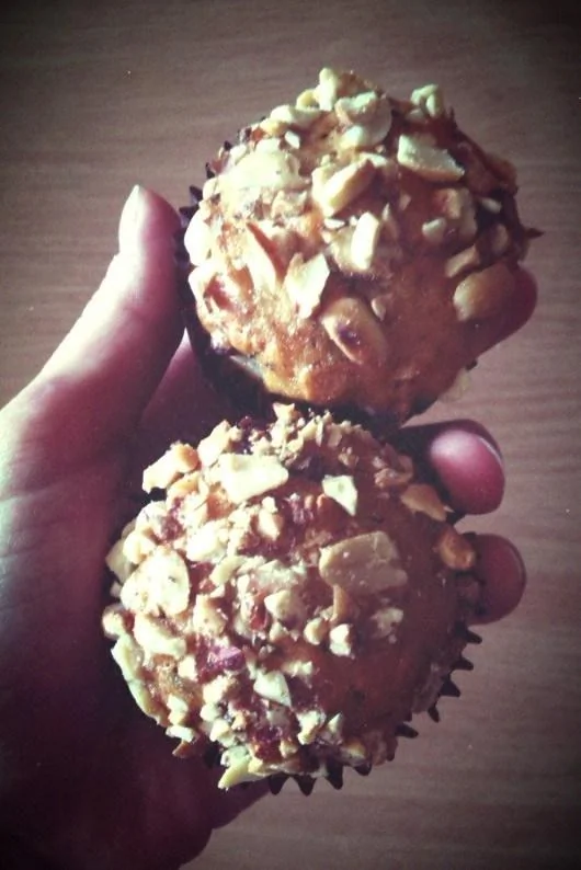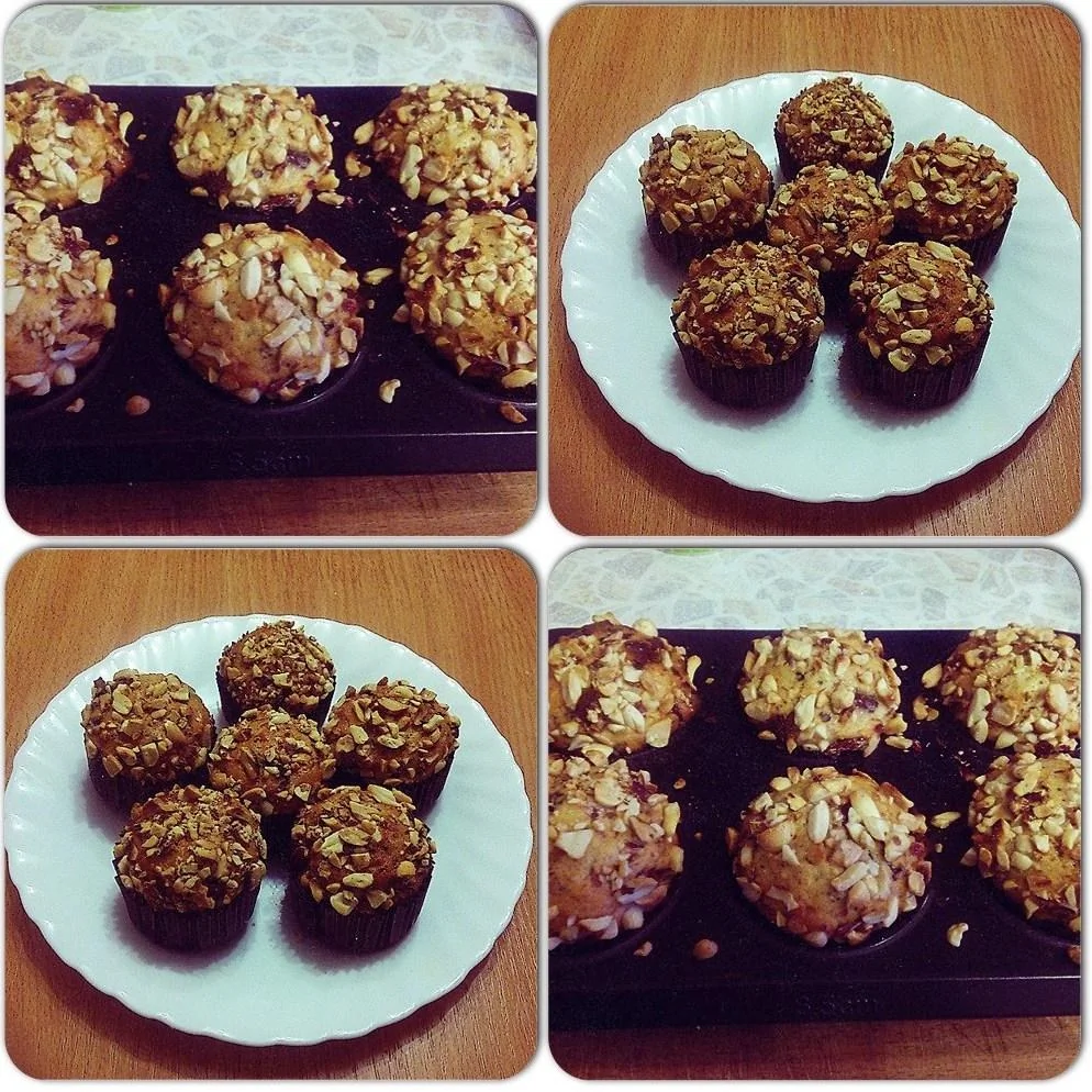 ШАГ 4 Заполнить тестом любые подходящие формы. Сверху каждый кекс посыпать орехами.