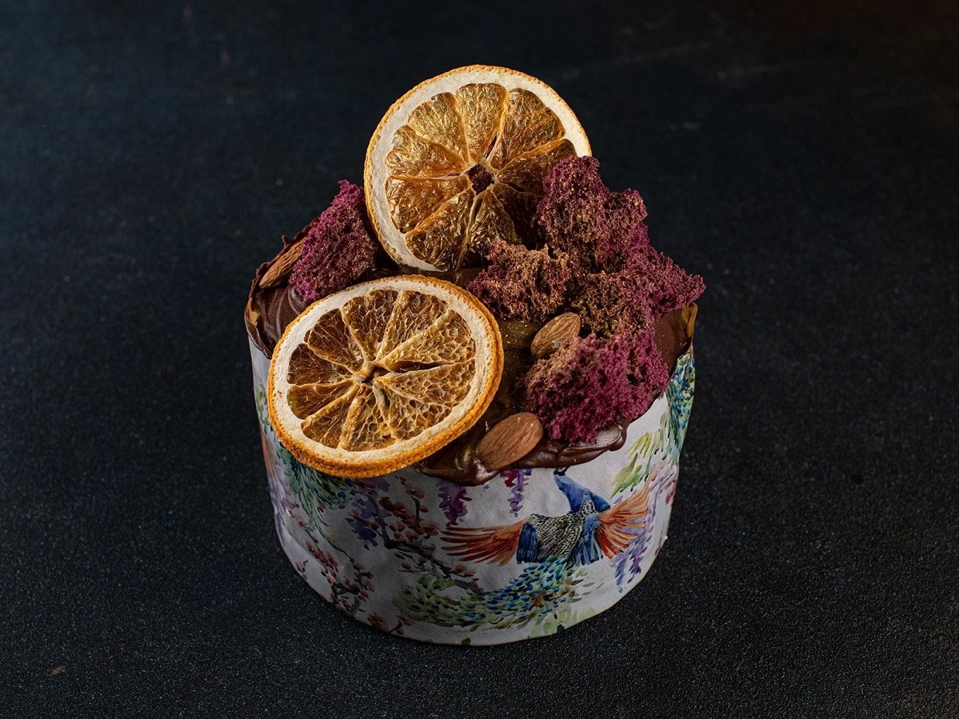 ШАГ 8 Охлажденный кулич заглазировать ганашем и украсить миндальными орехами и слайсами апельсина.