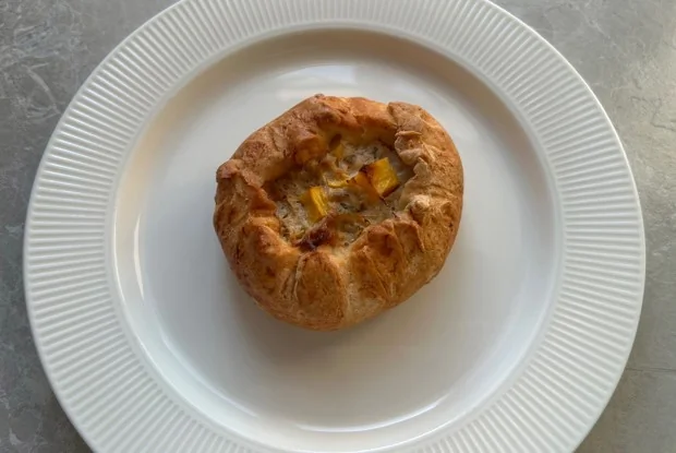 ШАГ 9 Каждую часть раскатать, добавить в центр начинку и подогнуть края к центру.