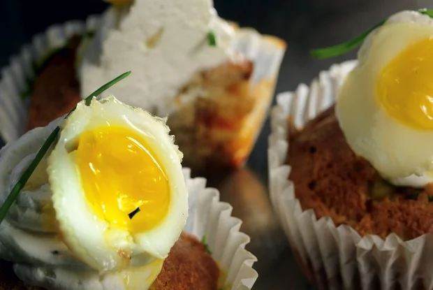 ШАГ 6 Готовые кексы украсить завитками сырного крема, на него выложить перепелиные глазуньи — и завершить композицию оставшимися перьями лука-резанца. Их надо разрезать пополам, чтобы из четырех стрелок получилось восемь.