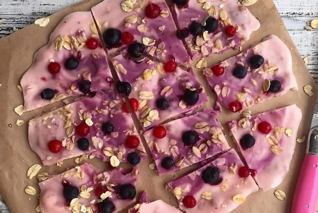 ШАГ 2 ​На большую плоскую тарелку положите кусочек пергамента, на него равномерно распределите йогурт толщиной в 2 мм. Сверху посыпьте ягоды и мюсли. Уберите в морозилку на ночь
