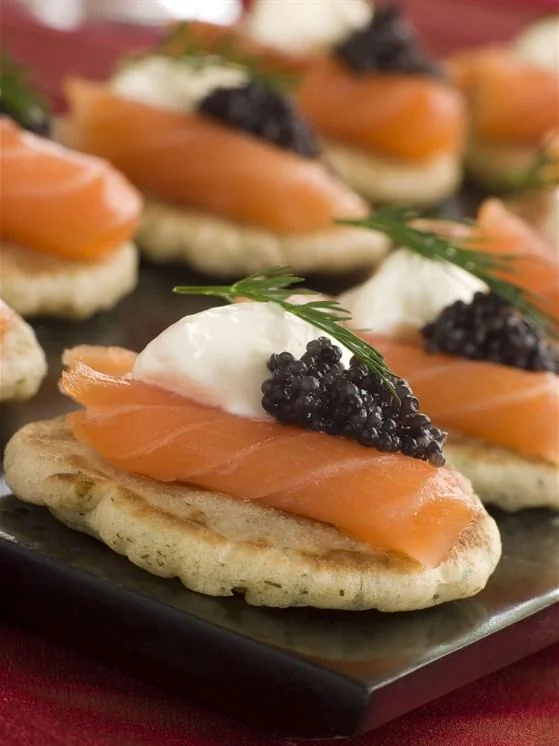 Гречневые мини блины с копченым лососем и икрой