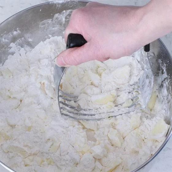 ШАГ 1 На рабочую поверхность высыпать муку, сахарный песок, соль и разрыхлитель. Посередине горки сделать углубление, разбить в него яйцо и взбить вилкой. Добавить охлажденное сливочное масло, нарезанное мелкими кусками.