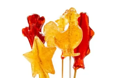 ШАГ 9 Чтобы сделать петушки на палочке интереснее, можно добавить в горячую карамель пару капель красителя или пищевые блестки, а затем также разлить по формам.