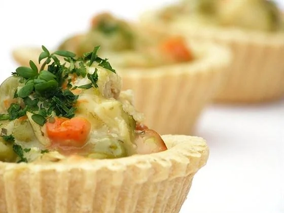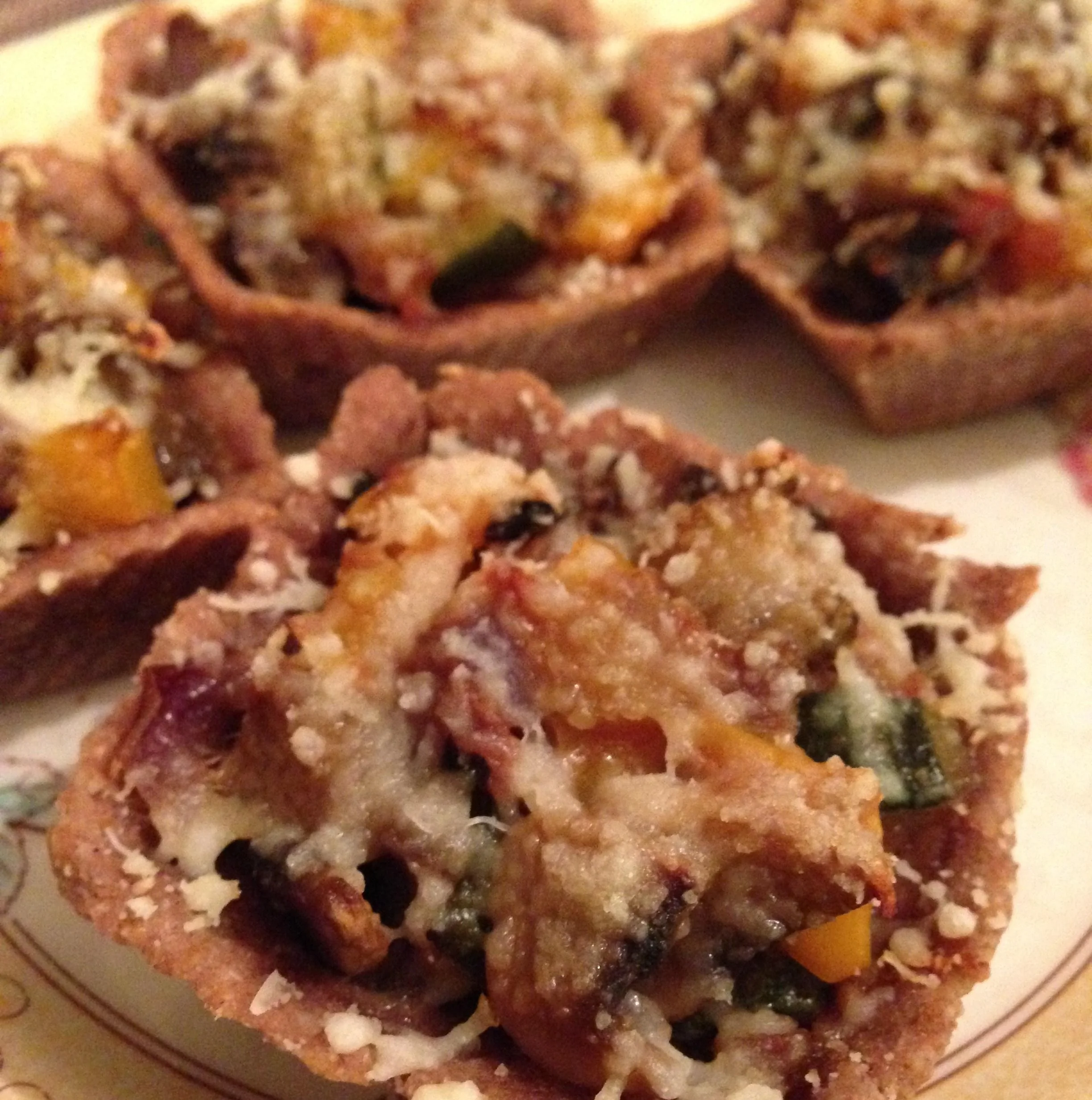 ШАГ 5 Через 5 минут достать полуготовые основы для тарталеток и выложить в них тушеные овощи, а сверху потереть пармезан.