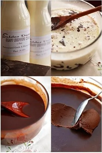 ШАГ 2 На медленном огне довести до кипения смесь жирной сметаны, масла и рома. Как только смесь подаст признаки закипания, вылить ее в миску с поломанным шоколадом.