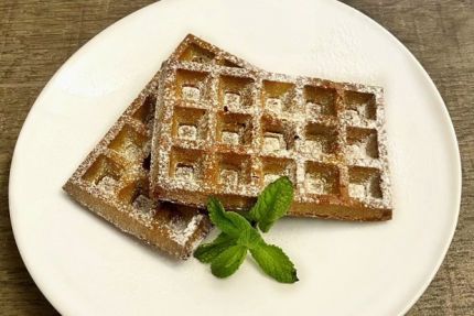 ШАГ 12 Достать ПП-вафли из духовки, вынуть из формы, украсить мятой и сахарной пудрой.