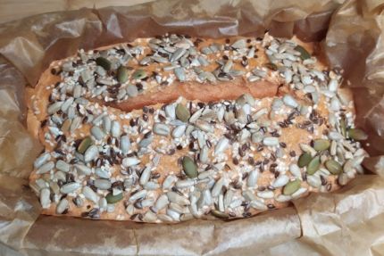 ШАГ 11 Посыпать смесью семян, поставить в разогретую духовку и выпекать 45–50 минут при температуре 200 градусов.