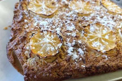 ШАГ 11 Лимон нарезать дольками и выложить сверху на запеканку, немного посыпать дольки сахаром.