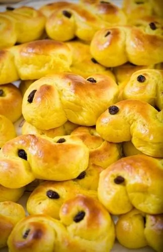 ШАГ 1 В небольшую емкость налейте теплую воду и насыпьте дрожжи. Перемешайте, пока не растворятся и добавьте шафран, снова перемешайте. Добавьте размягченное сливочное масло. В другой миске смешайте муку и соль, затем добавьте сахар и изюм.