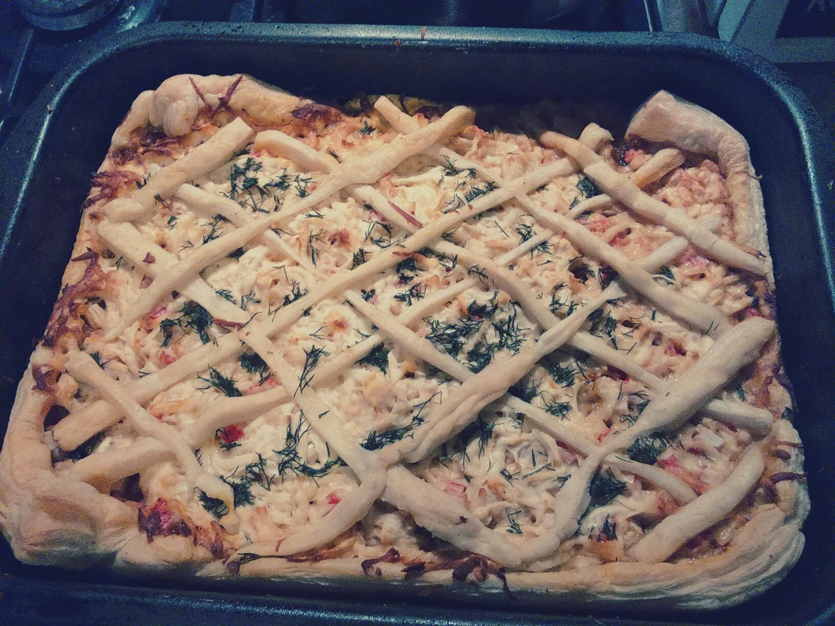 ШАГ 3 Форму для выпечки смазать сливочным маслом, выложить тесто, сделав бортики. Намазать тесто полученным томатным соусом, выложить нарезанные крабовые палочки, сверху покрошить брынзу.